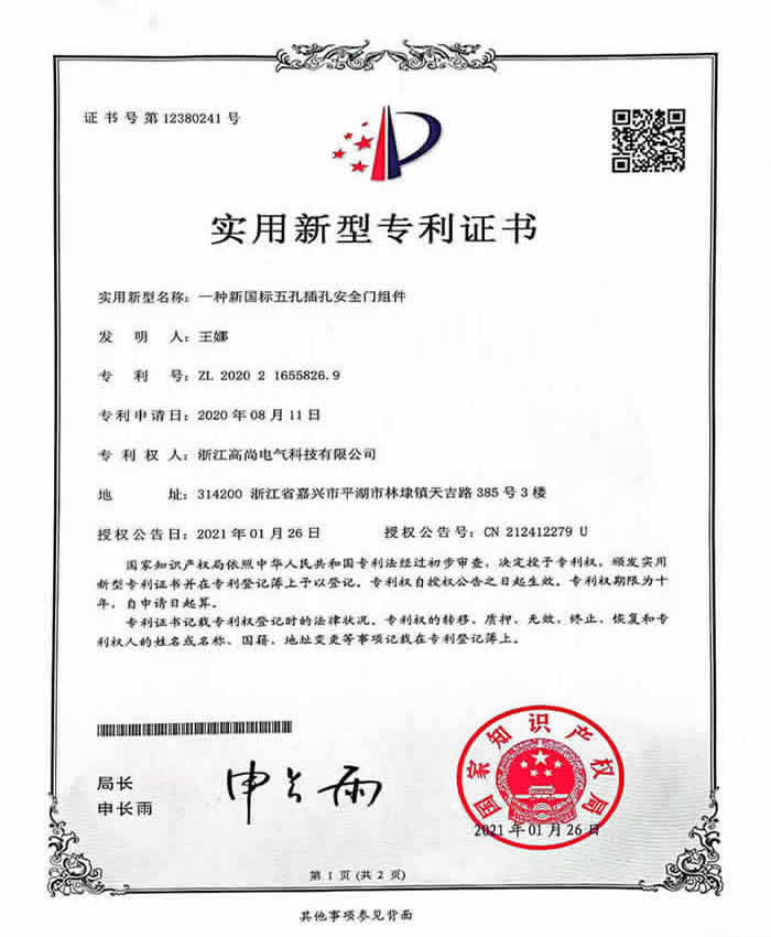 五孔安全组件专利证书